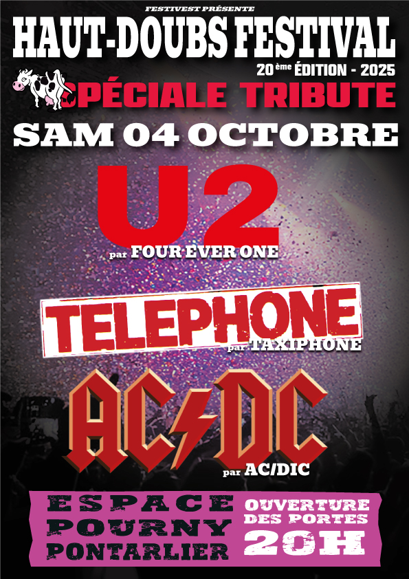 La 20e édition promet une soirée inoubliable sous le signe du rock légendaire ! Pour marquer cet anniversaire, le festival propose une programmation spéciale Tribute Bands. Avec les meilleurs tribute du moment. For Ever One – Tribute U2 – TAXIPHONE – Tribute Téléphone – ACDIC – Tribute ACDC